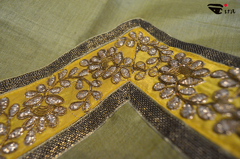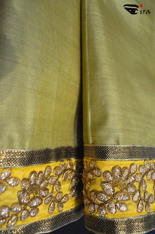 Pistachio green tussar silk sari with zari borders and trimming (includes blouse piece)